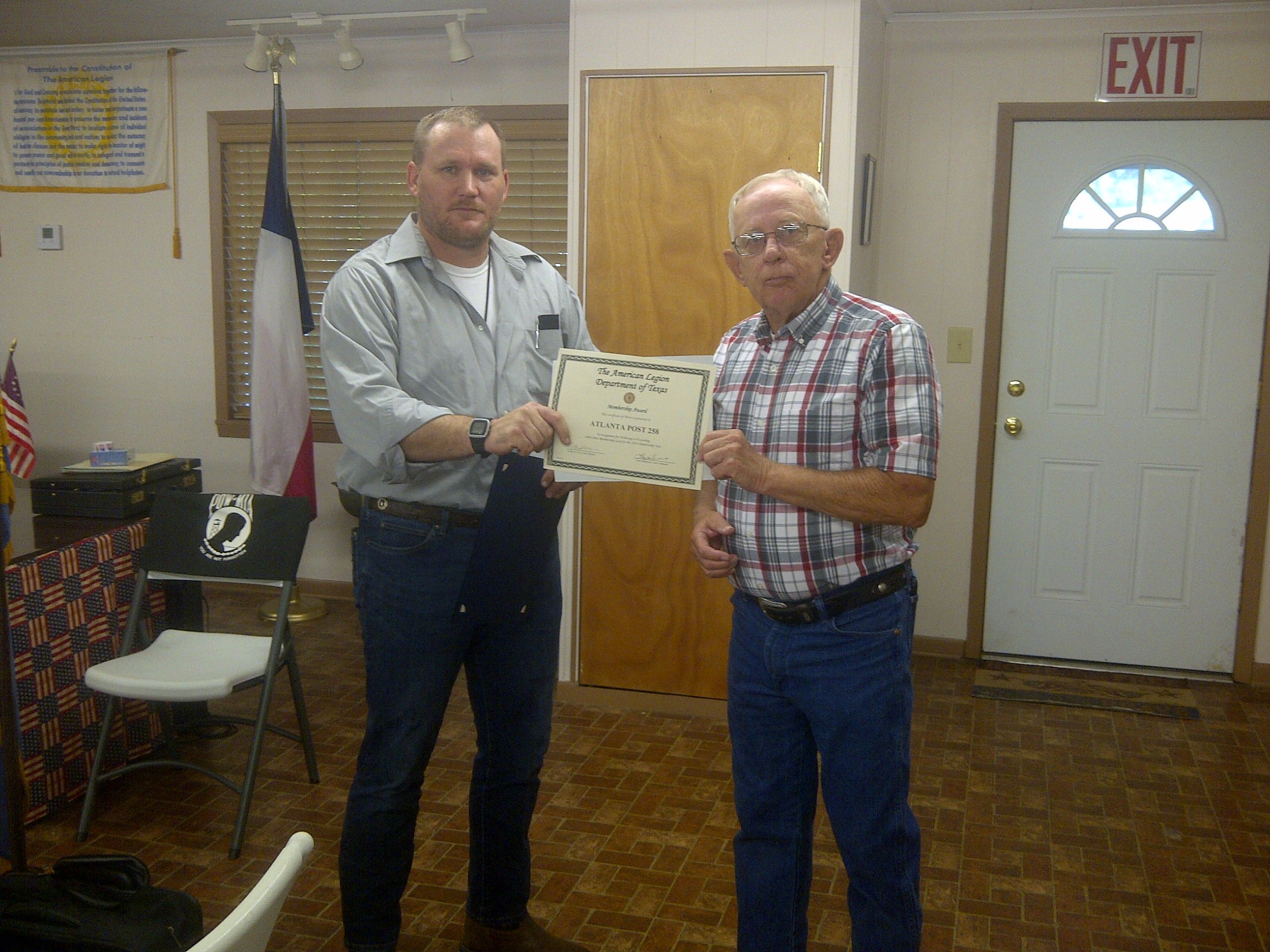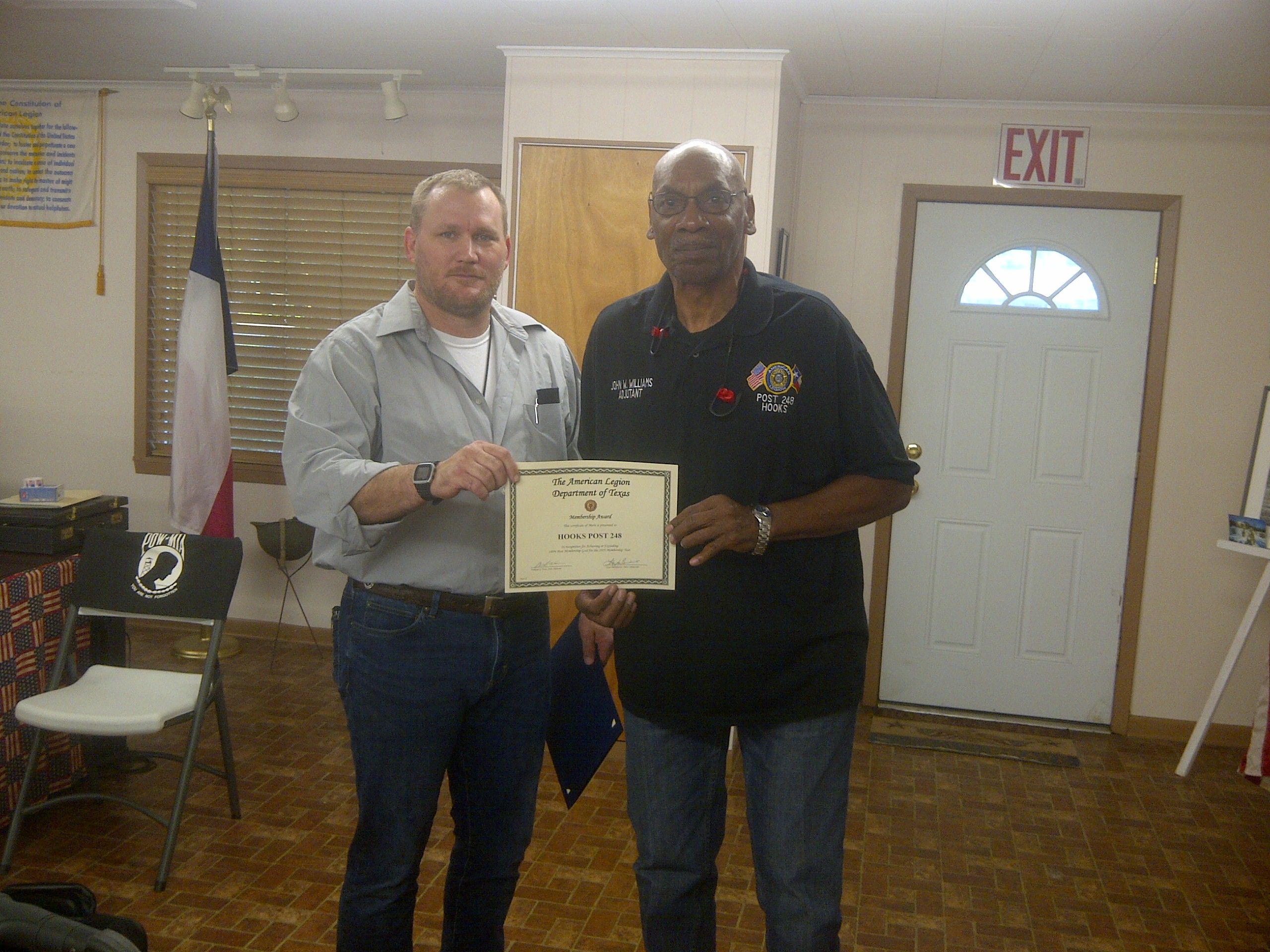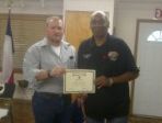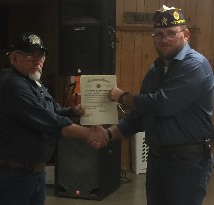 | John Williams, Hooks Post Adjutant, received awards from District Commander, Glenn Willis. | .