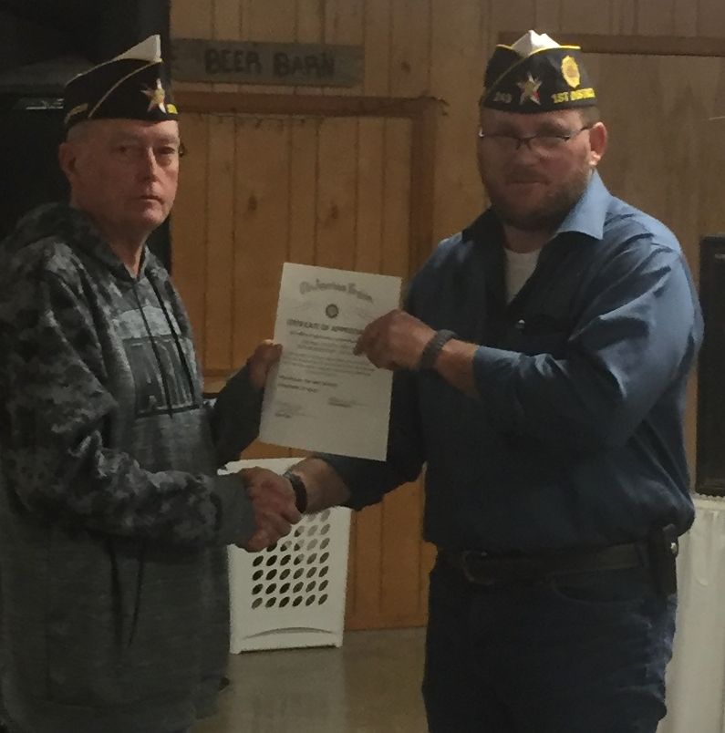 | Commander Willis presents the District Award for Americanism to Chad Roden Commander Post 243 Mt Vernon. |