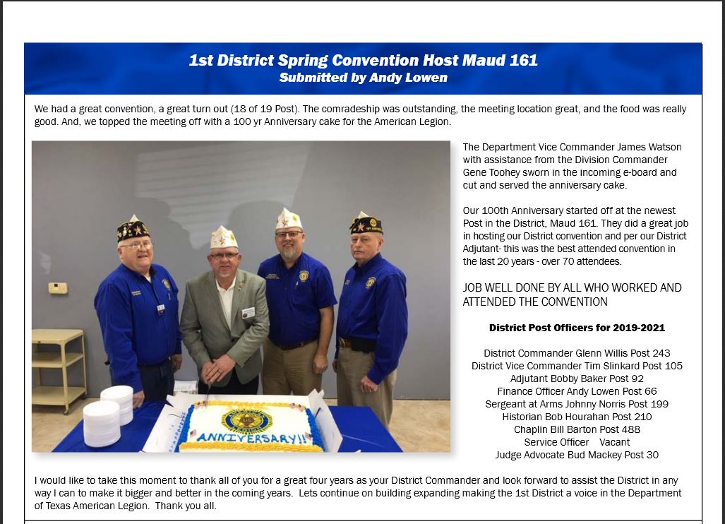 | 2019-04 | Legion Times (Apr): 1st District Spring Convention, Host Maud 161