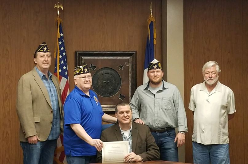 2019-03-08 Judge Doug Reeder proclaims 15 March '19 as American Legion Centennial Day in Morris County (document) (photo) (L to R in photo) Troy Kersey, Bobby Baker, Morris County Judge Doug Reeder, 1st District Zone Commander Glenn Willis, James Clark |