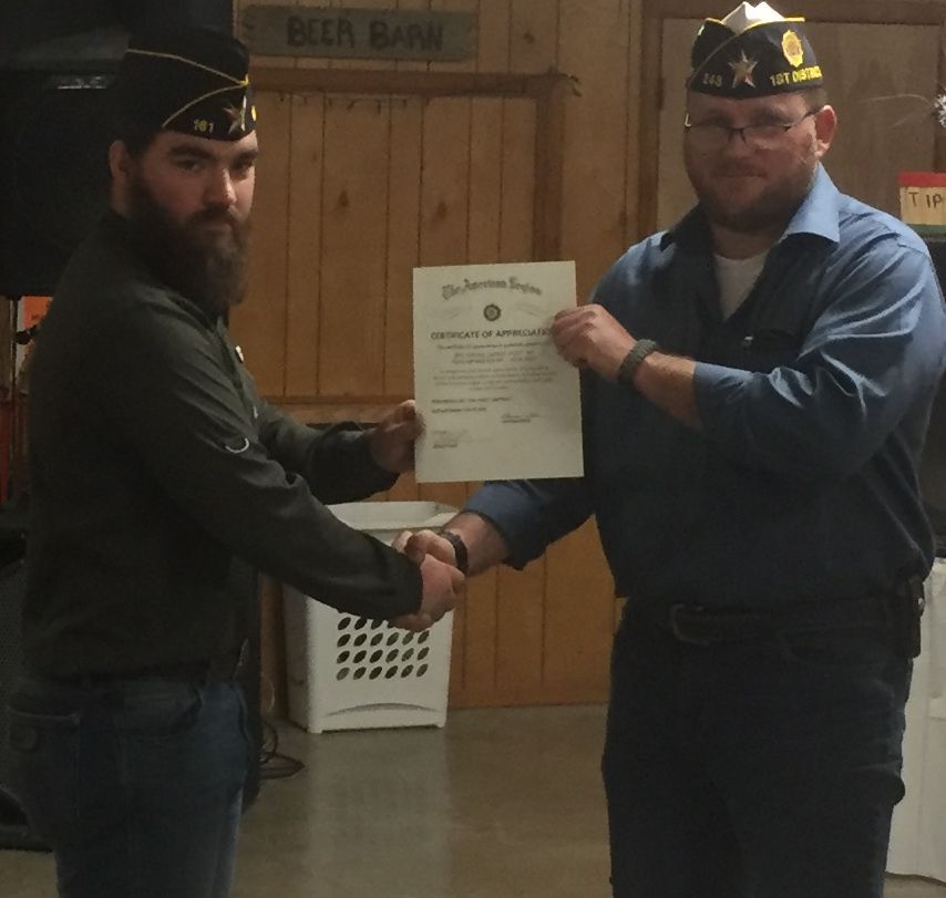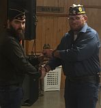 | Commander Willis presents a for obtaining over 100% to Post 161 Vice Commander Cody Cummings. |